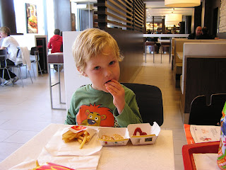 Minulý týden na ORL kontrole pan doktor prohlásil, že je David v pořádku. Jen sliznice v dutinách má ještě zbytnělé. Bylo by tedy dobré, kdyby hned nedostal další rýmu, hrozila by recidiva zánětu dutin. Bylo mi jasné, že když půjde David v pondělí do školky, nejpozději ve středu rýmu mít bude. Jak jsem totiž stačila zjistit, do naší třídy je bohužel běžné dávat děti s "tuberáckým" kašlem i různě zbarvenými rýmami. Dlouho jsem to v sobě řešila, nakonec padlo rozhodnutí, že bude David ještě týden doma. Jenže už jsem dnes akutně potřebovala oběhnout a vyřídit si nějaké věci, jednání na úřadě, nákupy apod. Nezbylo, než vzít Davida s sebou. Ale zatímco já trpím výčitkami svědomí, že tahám malé dítě po takových otravných záležitostech, David si to docela užíval. Protože se nám jednání protahlo déle než jsem počítala, museli jsem neplánovaně zaskočit na pozdní nezdravý oběd. Davídek nakonec prohlásil, že do školky nikdy, nikdy nepůjde.